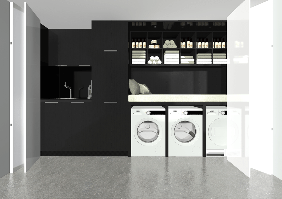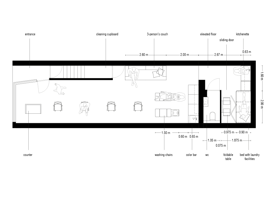 How can a small commercial space offer more possibilities? When Fidel moved to his new space, he asked for a salon that fits both his clients and his own needs. The result was a multifunctional room at the back of the shop that leaves space for all the primary functions at the front. A large new wall cabinet incorporated a kitchenette, an area for washing and drying machines, storage space and a whole new bed. There was even space for a foldable table with two chairs for lunch! All the “secondary” but necessary functions of the shop were gathered in one long cabinet and hidden from the public behind foldable wooden doors.